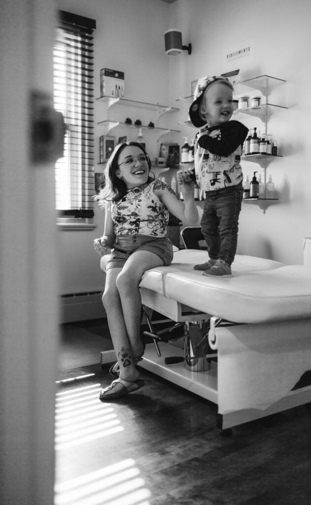Laurie est une jeune femme calme, ouverte d’esprit au sens de l’humour très développé! Elle travaille dans le salon d’esthétisme de sa mère, qui est coiffeuse. Dans un tiroir du comptoir d’accueil de cet établissement se trouve une lettre écrite il y a quelques années par une enfant remplie de rêves. À 10 ans à peine, Laurie savait ce qu’elle voulait; un jour, elle vivrait avec son conjoint et ses enfants, puis participerait au développement de ce centre de beauté. Elle a maintenu le cap sur ses objectifs, et les deux femmes offrent maintenant à leur clientèle des soins basés sur le bien-être dans le respect de tous les types de corps. Elles ont à cœur de créer un environnement inclusif. Comme vous pouvez le voir sur cette photo, la fille de Laurie évolue elle aussi dans ce milieu autant professionnel que familial.